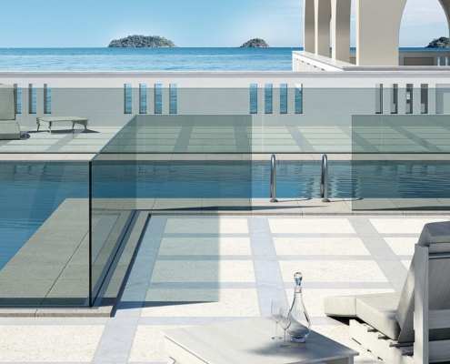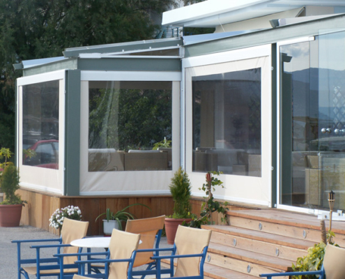 Zu unserem Sortiment gehören Sichtschutzelemente, Rollfenster aus Folie und Ganzglasgeländer, die auch auf Maß angefertigt werden.